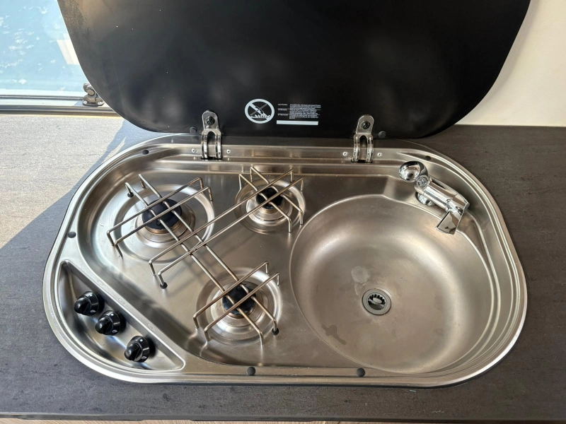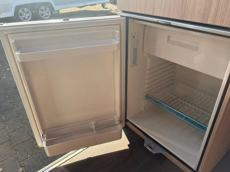 El aire acondicionado mejora la comodidad. Esta autocaravana está totalmente equipada con cocina de gas, aire acondicionado, depósito de agua potable y residual, nevera, cierre centralizado, amplia trampilla de techo, toldo, ordenador de a bordo y volante ajustable con dirección asistida.