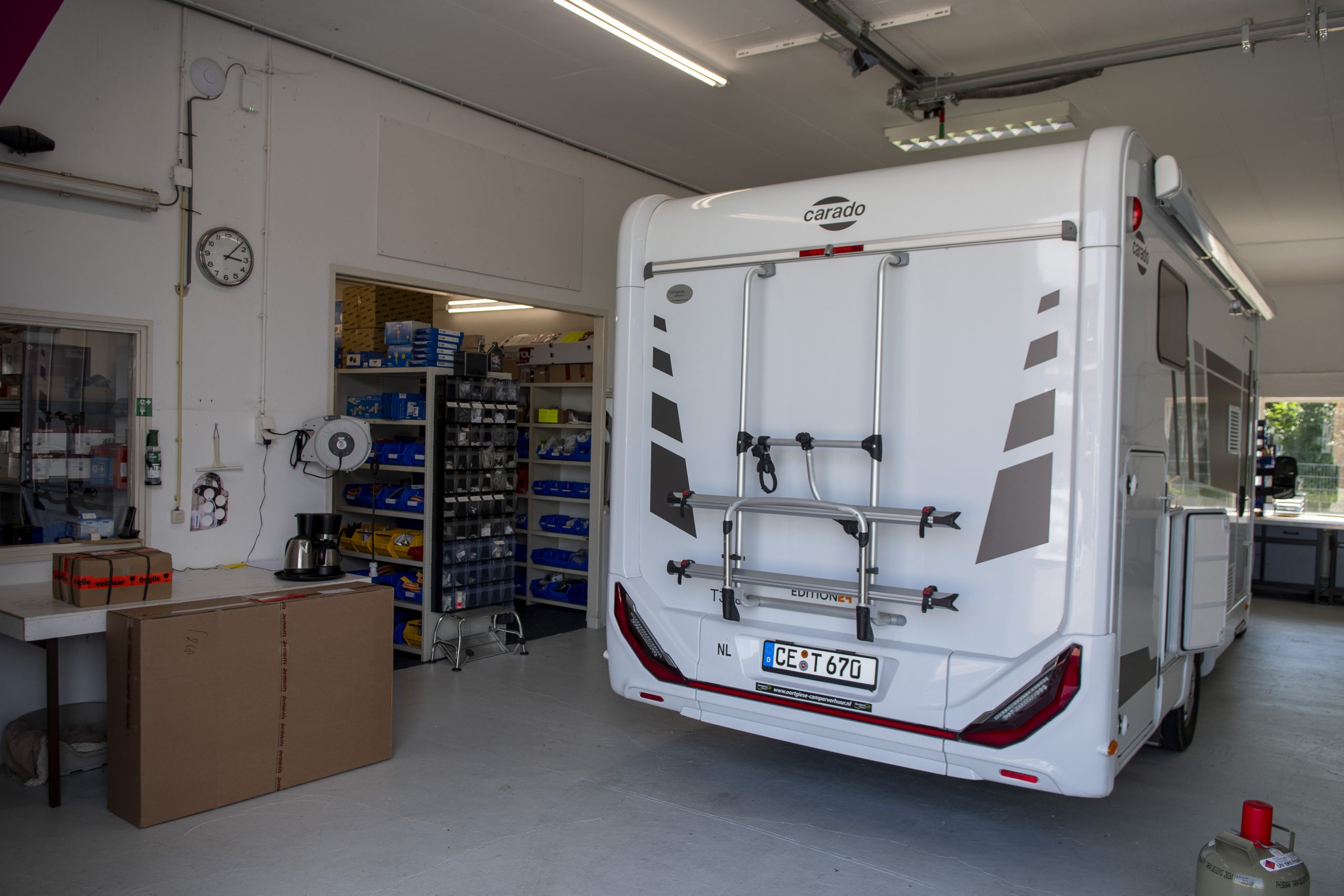 El mantenimiento de una autocaravana puede ser complicado. ¿Deberíamos ir a un taller que no entienda mucho del habitáculo, o viceversa? Oortgiese Campers cuenta con varios talleres para las diversas disciplinas que requiere una autocaravana. El habitáculo recibe toda nuestra atención en un espacio impecable, diseñado para cambiar un grifo que gotea o reparar la nevera sin dejar rastro. Un cambio de aceite, un cambio de neumáticos o un nuevo juego de correas de distribución se realiza en otro taller, que incluye un elevador de vehículos de 5 toneladas. Lo mismo ocurre con la reparación de daños, el departamento de pulido o la instalación de accesorios adicionales: cada uno tiene su propio departamento con especialistas expertos en su campo.